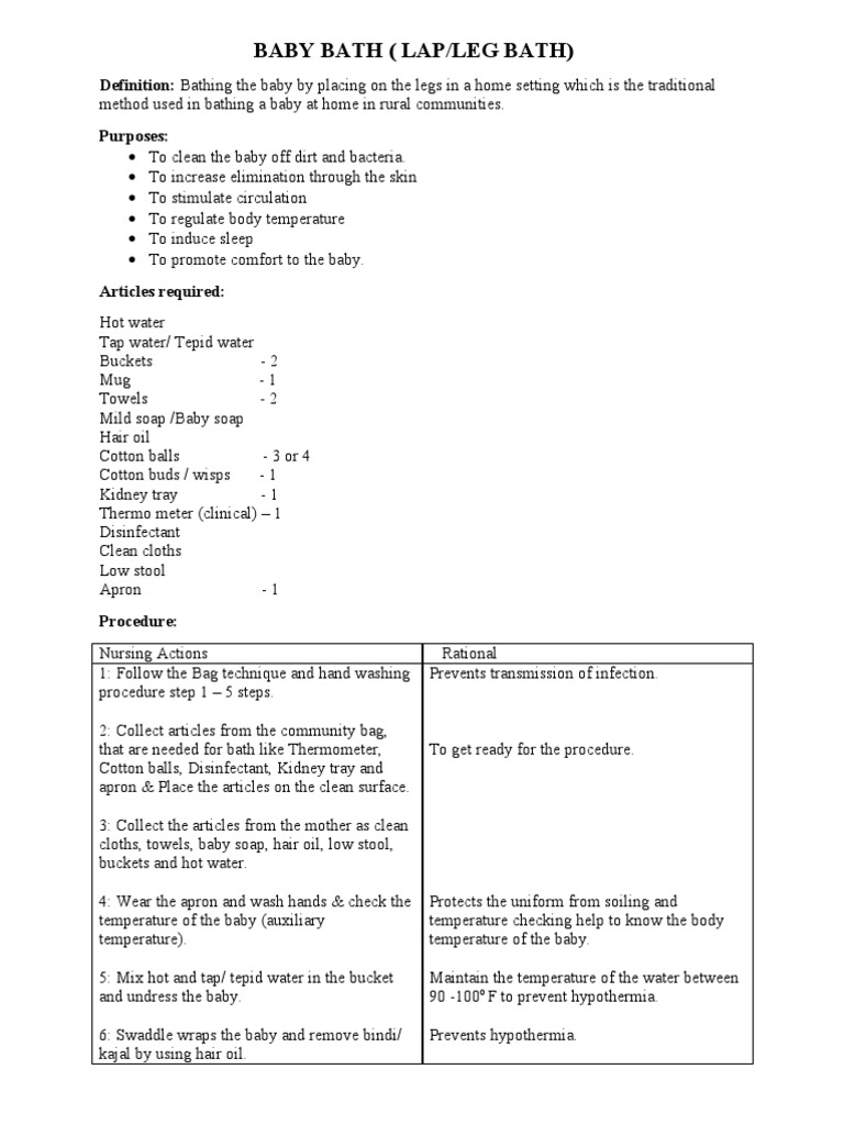 Bathing your baby too much can dry out his or her skin. Fr montage et utilisation bath water should never exceed 100 deg f (37.8 deg c). Sponging, tub bath, lap bath, oil bath, ideal time for bathing, all information about infant bath nursing procedure bath types information given below. When and how to wash a baby's face. Explain the purpose and procedure to the fundamental of nursing procedure manual. Find out what bath products you need and tips to bathe your baby safely. Cover the surface with a thick towel. ·the bath order may have changed. Bathing is a stressful procedure for premature infants that, despite triggering an adverse physiological response, provides many benefits such as the elimination of. What you need for your baby's bath. Common questions about bathing a newborn. Our database contains more than 1 million pdf manuals from more than 10,000 brands. • babies have drowned even with other children in or near bath tub.
